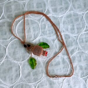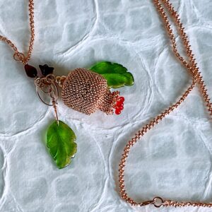 This beaded pomegranate is an art piece. It is handbeaded using hundreds of 15/0 Miyuki glass beads. The chain is hand beaded with a combination of 11/0 and 15/0 Miyuki gold beads and is a long 26”. The pomegranate is suspended by gold fill wire and chain that holds green Czech glass leaves and a red pomegranate flower, and red pom bead faceted crystal.