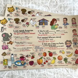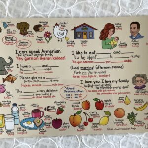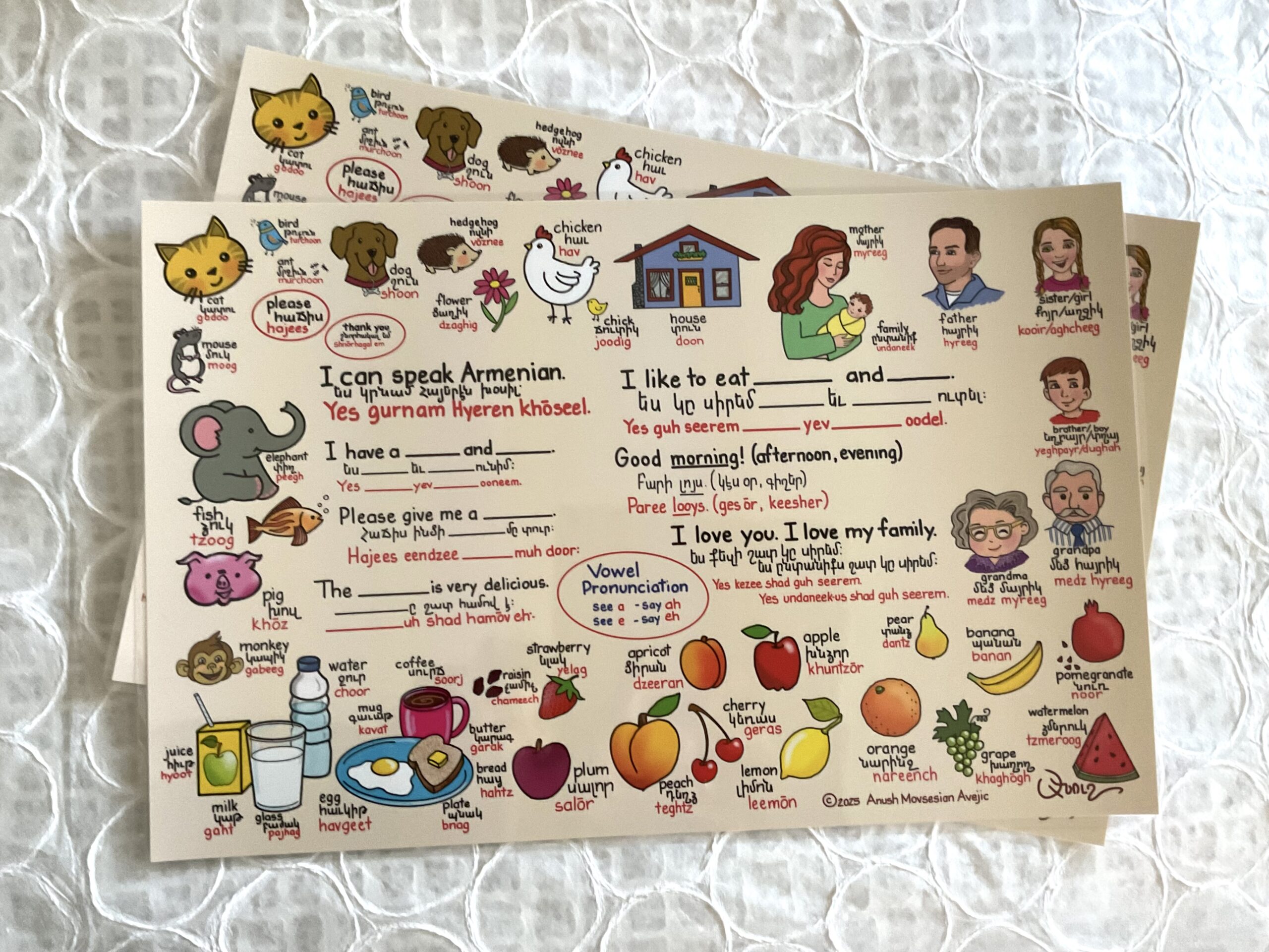 Learn western Armenian while you eat! My illustrated 11” x 17” placemat teaches the names of animals, family members, fruits, and and more in Armenian letters as well as Armenian transliteration. The center section allows you to plug in the new words into conversational sentences. This is a fun way for the whole family to learn our beautiful language.