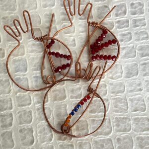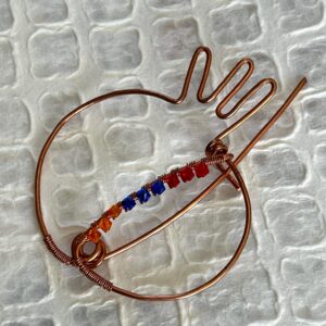 Copper wire bends and flows into this beautiful brooch that can be worn as a sweater, hat, or a scarf pin. Created for loose knits, this pin will be a bold accessory to spice up your toasty accessories. Red, Blue and Orange Swarovski Crystals adorn the cross piece in the beautiful colors of the Armenian Flag. 3” x 3 1/2”