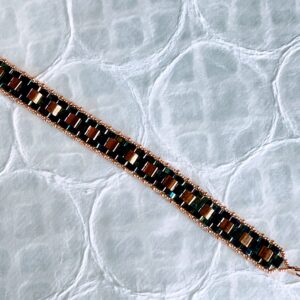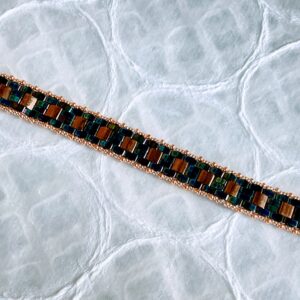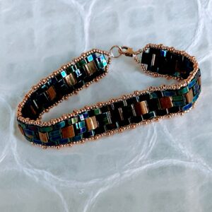 Beautiful flat iridescent beads are woven into a very stylish and shimmery bracelet