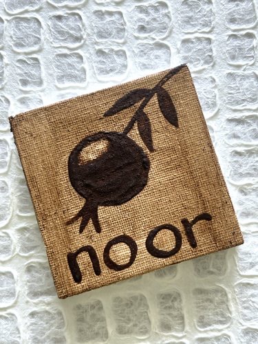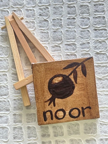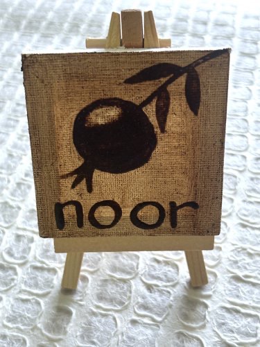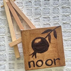 This is a small 3″x3″ Armenian coffee painting with easel. It reads “noor” or the word pomegranate in Armenian. The size makes it perfect for desktop or office or tiny spaces that need a little art! This makes a great gift for college students (or anyone) who lives in tiny spaces and appreciates original artwork.