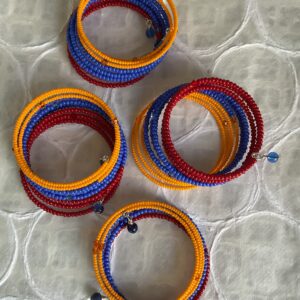 These are super fun, adjustable bracelets in Armenian flag colors of Red, Blue and Orange. They are beaded on memory wire, which coils around your wrist no matter the size. Tiny glass seed beads with Swarovski crystals and blue beads on each end.