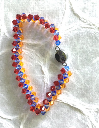 Beautiful woven Swarovski Crystal bracelet in Armenian flag colors of red, blue and orange, with silvertone magnetic clasp.